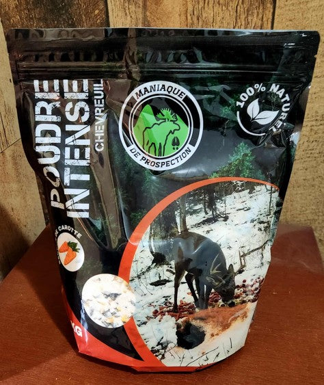Poudre intense chevreuil 100 % naturelle, saveurs carotte. Appât québécois performant pour la chasse d’automne.